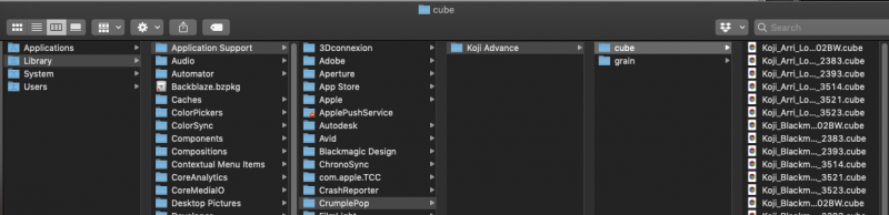 On macOS if you install the plugin, the LUTs can be found in: /Library/Application Support/CrumplePop/Koji Advance/Cube